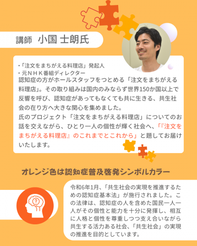 「注文をまちがえる料理店」発起人の小国士朗さんをお迎えし、「『注文を間違える料理店』のこれまでとこれから」という題目でお届けします。